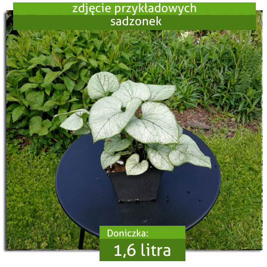 Looking Glass to wspaniała odmiania cechująca się dużymi liśćmi w srebrzystym kolorze, który utrzymuje się przez cały sezon! Prezentowana brunnera osiąga 30-40 cm wysokości i tworzy ładne zwarte kępki, niezwykłego uroku tej wspaniałej bylinie dodają liczne, drobne błękitne kwiaty które zdobią brunnerę w maju i czerwcu. Należy sadzić ją w miejscach półcienistych w glebie żyznej i próchnicznej. Bardzo ładnie prezentuje się w otoczeniu żurawek, funkii, epimedium oraz wilczomleczy.