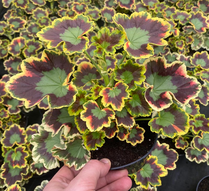 Mrs. Pollock - niezapomniana dama w świecie pelargonii. Jej piękno nie ma sobie równych - liście w odcieniach zielonego, złota i brązu, zdobione unikalnymi paskami i plamami, tworzą niepowtarzalny efekt, który kradnie serca ogrodników na całym świecie. Ta świetna odmiana jest ozdobna nie tylko z wyjątkowo dekoracyjnych liści, ale także ze wzniesionych półpełnych szkarłatno-czerwonych kwiatów wyrastających ponad liśćmi i zdobiących roślinę od wiosny aż do późnej jesieni. Jej kwiaty, choć skromne, dodają uroku i delikatności, tworząc harmonijną kompozycję z wyrazistymi liśćmi.