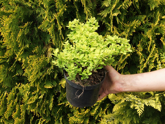 Sadzonki tawuły brzozolistnej Tor Gold oferujemy w pojemniku 2 litrowym.