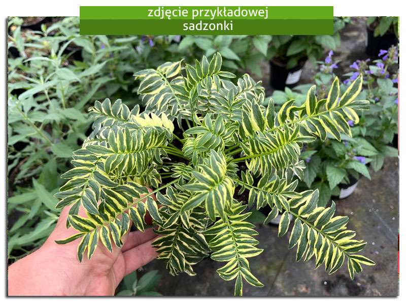 Wielosił pstry 'Brise d'Anjou' (Polemonium caeruleum) jest wyjątkową rośliną ozdobną, cenioną głównie ze względu na swoje wspaniałe dwubarwne ulistnienie, które wyróżnia ją spośród innych bylin. Roślina rozwija się bujnie, tworząc gęste i niezwykle efektowne kępy, osiągające nawet do 70 cm wysokości (wraz z kwiatostanem). Jej kwiaty, delikatne o pastelowym, niebiesko-fioletowym odcieniu, oraz dwubarwne liście, z zielonym wnętrzem i szerokim, złotym marginesem, stanowią niepowtarzalną ozdobę ogrodu. Z biegiem czasu liście nabierają pięknych jesiennych barw, dodając uroku krajobrazowi. Okres kwitnienia przypada od czerwca do sierpnia, wzbogacając otoczenie swoim pięknem i aromatem. Wielosił pstry jest także cenną rośliną miododajną i leczniczą, co dodatkowo podkreśla jej wartość w ogrodzie.
